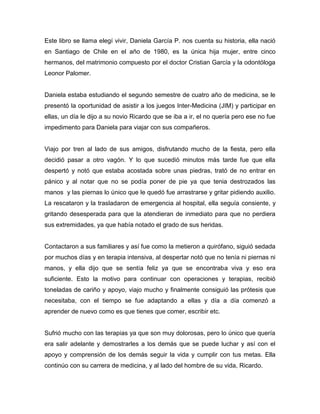 Pues este libro trata de una chica universitaria que al sufrir un grave accidente se da cuenta de las verdaderamente importantes cosas de la vida que tus seres queridos estaran siempre que los necesites y que si te propones algo con toda tu fuerza de voluntad lo lograras. F6-Cmo reacciona Daniela al. Durante un viaje universitario en tren una joven estudiante de Medicina cay a la lnea frrea desde el vagn en que iba perdiendo sus manos y piernas.